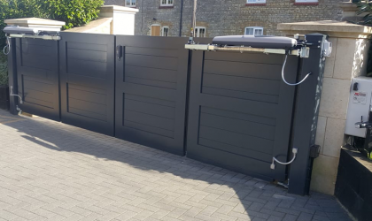 A sliding gate was also ruled out due to the location of the piers and the rear run taking up too much driveway. Aluminium was agreed for the material as this is an exceptionally good product for Bi Folding gates due to its lightweight structure and long lasting durability. Colour was also agreed to be anthracite grey to be in keeping with the already installed anthracite grey windows. Automation was via 24v mechanical rams at the top of the gates to allow them to be manually release using a key from outside of the property in case of a power cut as this was the only entrance.